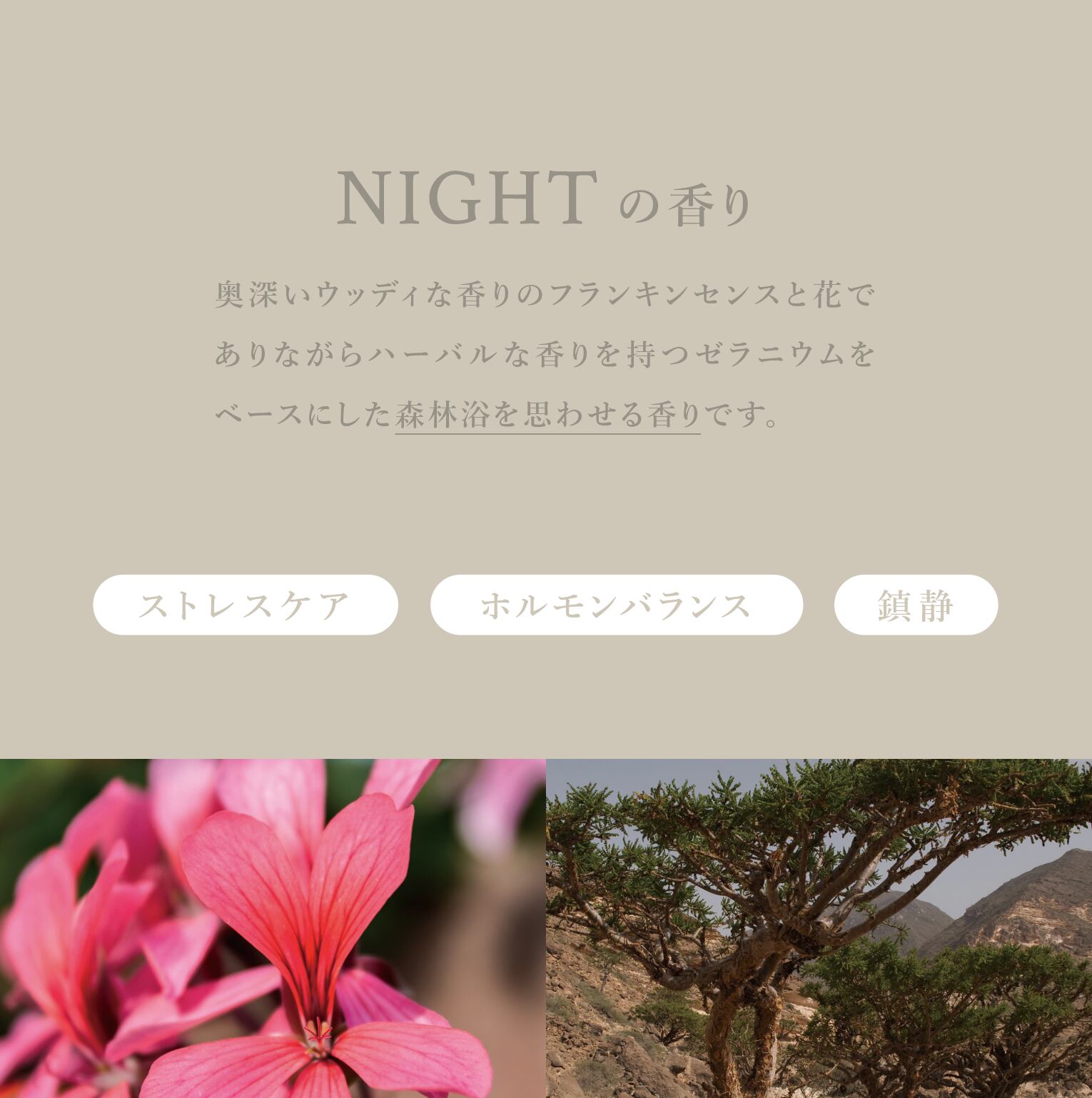 奥深いウッディな香りのフランキンセンスと花でありながらハーバルな香りを持つゼラニウムをベースにした森林浴を思わせる香り。